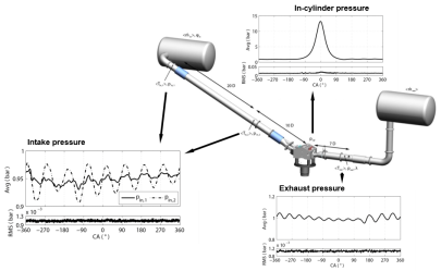 The motivation of this test bench is to enable reproducible engine operation for a large variation of measured quantities, while resolving a plurality of parameters and characterizing engine operation. It allows conditioning the intake air in terms of pressure, temperature and gas composition, port fuel injection of liquid and gaseous fuels, direct-injection, as well as reliable boundary condition control and measurement. Further details of the intake and exhaust systems were designed to provide reproducible thermodynamic and flow boundary conditions and simplified meshing for three-dimensional engine flow simulations. Figure 1 shows a schematic of the engine test bench from the intake to the exhaust plenum. It shows the locations for which fluid dynamic and thermodynamic conditions were measured during engine operation together with examples of pressure traces.